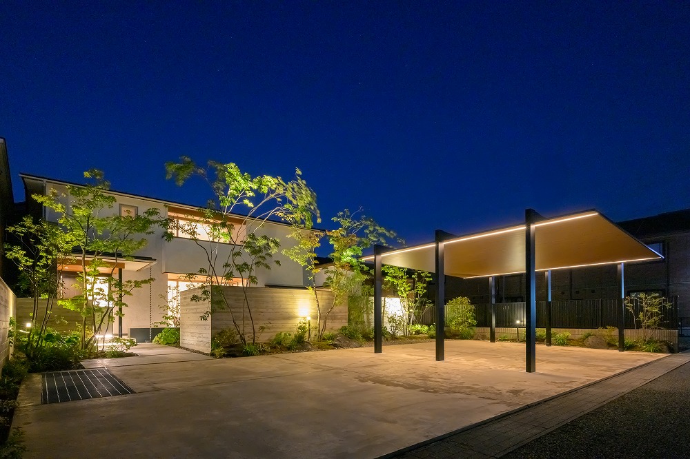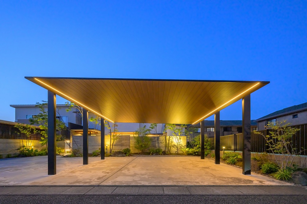 6年前に工事をさせて頂いたお客様のカーポート工事。テーマは住宅・緑・光との調和としています。 広い敷地であり、全体の外観バランスを最優先にしていることも相まって、長らく“新商品待ち”の状態となっていました。 カーポートSCであればご納得頂けると思っていたところ、積雪1メートルに対応するタイプの発売を知りご提案。 カーポートに照明を配置して防犯性を向上させ、既設のライティングとともに夜間の美しい景観をつくっています。